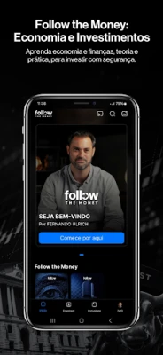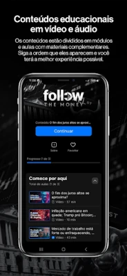 O aplicativo Follow the Money disponibiliza conteúdos educacionais sobre economia, finanças e investimentos produzidos em vídeo e áudio que podem ser baixados para assistir onde e quando quiser.